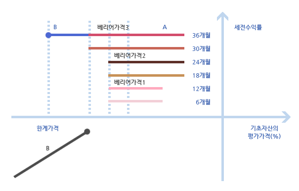 6개월에 한 번씩 있는 조기상환평가일에 기초자산 가격이 일정 수준 이상이면 조기상환됩니다. 자산가격이 많이 하락하더라도 상환조건을 만족시키면 원금은 보장됩니다.